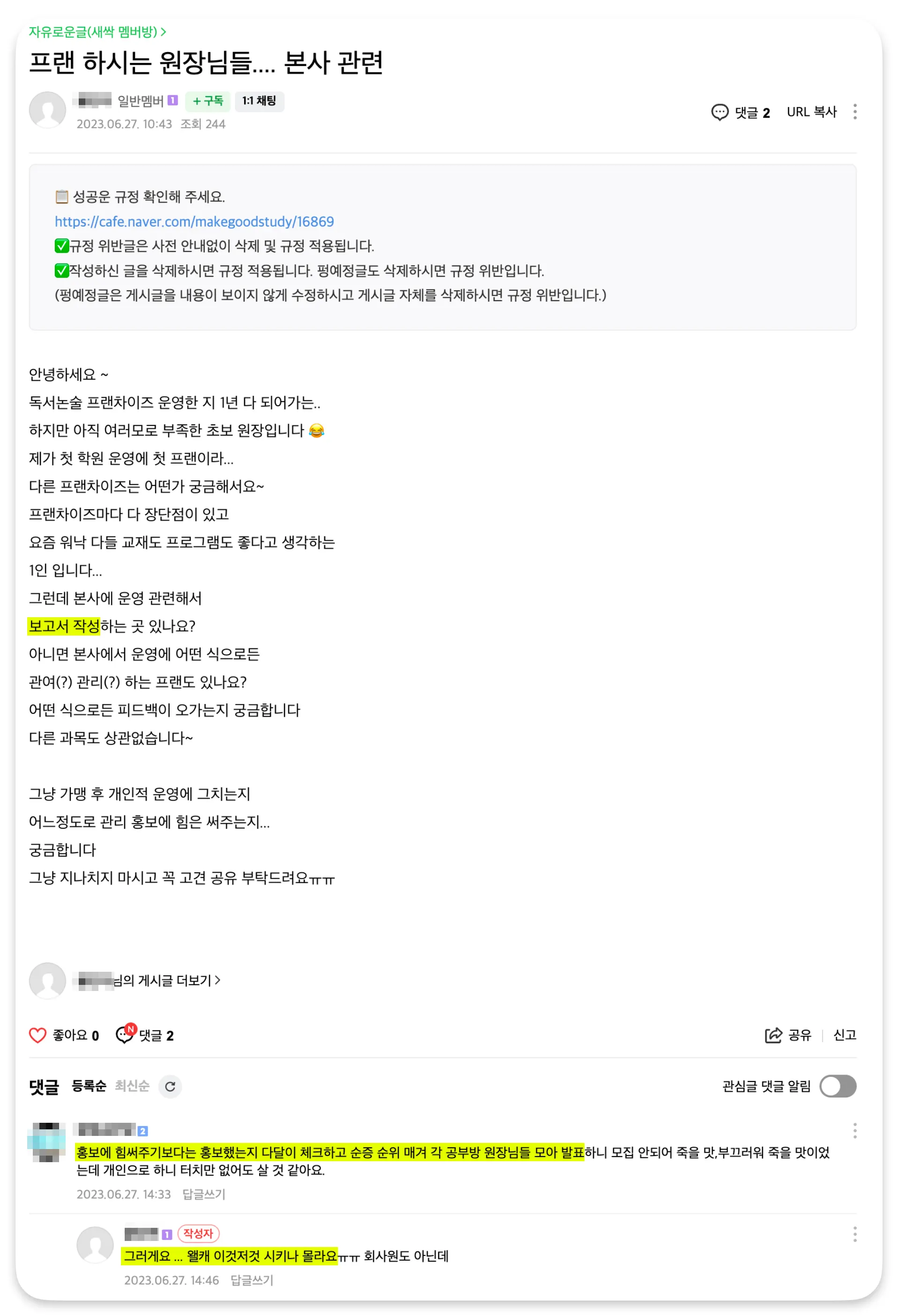프랜차이저(본사)는 프랜차이지(원장님)에게 상표를 사용할 수 있는 권한을 주는 대신, 브랜드 정체성을 유지하고 수익을 극대화하기 위한 관리를 하게 됩니다. 여러 가지 규정을 만들어 각종 행위를 규제하기도 합니다. 의무적인 홍보 활동(온라인 매체 글쓰기, 학부모설명회 개최, 등하교 전단지 홍보 등)도 해야 합니다.