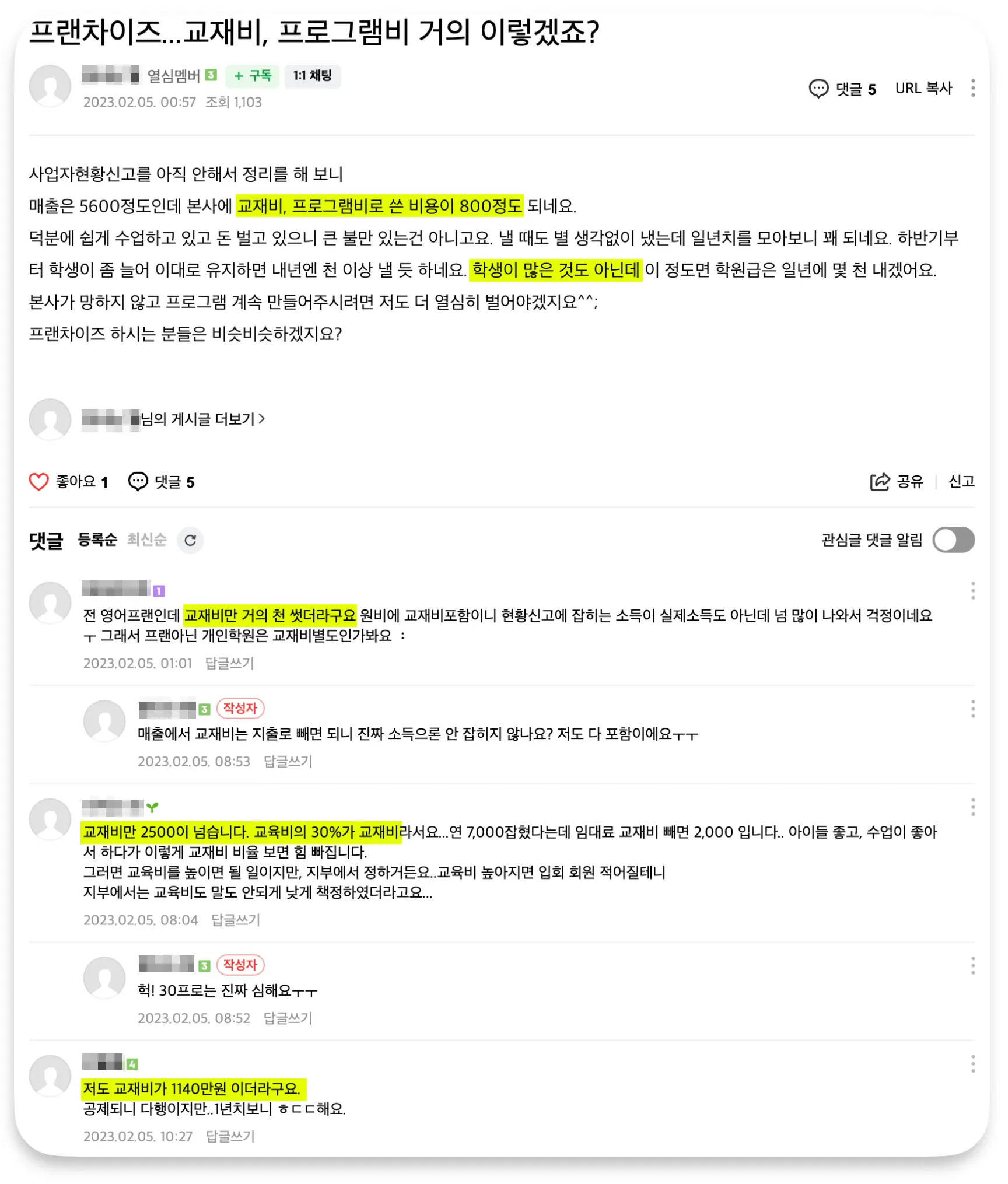 콘텐츠(교재)를 본사로부터 구입해야 합니다. 시중에 판매되는 교재에 비해 가격은 비쌉니다. 보통 회원 1명당 3~5만 원 정도의 교재비가 발생합니다. 회원이 많을수록 교재비는 더욱 비싸게 느껴집니다.